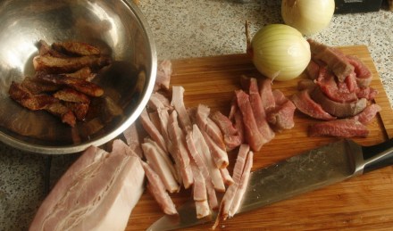 Mięso i boczek pokroić w paski. Cebulę w krążki. Czosnek obrać, wycisnąć przez praskę.