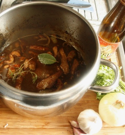 W rondlu lub na patelni z grubym dnem rozgrzać tłuszcz (w oryginale smalec, ja wzięłam masło klarowane, ale może być i olej), przesmażyć porcjami paski mięsa, a potem boczku razem z cebulą. Dodać i zasmażyć łyżkę mąki. Wszystko zalać piwem, a gdy ono zostanie wchłonięte – bulionem.