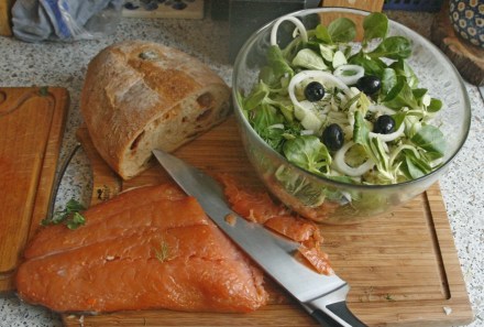 Wśród przedświątecznych przygotowań czasu mało, ale obiad i tak zjeść trzeba. Warto pomyśleć przy tym o szybkim zbiciu choćby pół kilograma wagi, aby się wbić w elegancki strój i jak najlepiej zaprezentować się rodzinie. Co podać na szybki i bezboleśnie przygotowany lekki obiad? Proponuję sałatę z łososiem. Łososia wędzonego na zimno najlepiej kupić w postaci filetu i ostrym nożem skroić z niego plasterki. Do tego zaopatrzmy się w chleb. Razowy albo inny, jaki lubimy. Nam ostatnio zasmakował chleb włoski, z suszonymi pomidorami i oliwkami. Miskę sałaty przyrządzamy z tego, co mamy pod ręką. U nas w lodówce stale stoją dyżurne oliwki, dlatego je dodałam. Poza nimi dajemy to, co świeżo kupione z warzyw. W przepisach wskazuję jedynie kierunek. Do sałaty i łososia można dodawać pomidorki koktajlowe lub zwykłe, świeże ogórki, paprykę, rzodkiewki… co tam wymyślimy. Będą także pasowały świeże zioła. A może chcemy podać któryś ser pleśniowy? Albo grecką fetę? Na pewno też będą pyszne.