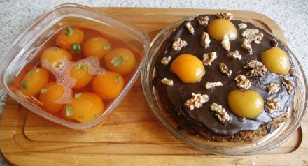 A teraz wyjaśnię, dlaczego na zdjęciu obok ciasta znalazła się galaretka. Gdybyśmy nie byli pewni, czy wszyscy z gości mogą jeść orzechy i czekoladę, albo byli pewni, że ktoś z nich na orzechy lub/i czekoladę jest uczulony, z pozostałych owoców zróbmy galaretkę. Zalewę owocową z puszki należy połączyć z żelatyną lub z gotowym proszkiem na galaretką morelową. W niej zatapiamy ładnie ułożone owoce. Oczywiście, galaretę sporządzamy zachowując proporcje podane na opakowaniu. Do syropu na nią można wkropić sok z połówki cytryny, będzie mniej cukierkowo słodka. A może zdrowsza? Płynem zalewamy owoce z puszki, do których można dołożyć np. cząstki mandarynek czy pomarańczy oraz kilka listków mięty lub melisy. I – voila! Nadmienię, że lekka galaretka owocowa jest także dobrą propozycją dla tych, którzy o linię i wagę dbają nawet podczas świąt. Zaręczam, że ktoś z naszych gości przyjmie ją z wdzięcznością.