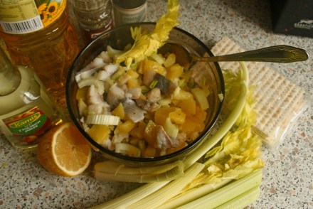 10 kartofli ugotowanych w łupinach, byle nie rozgotowanych, jeden duży seler, 2 śledzie wymoczone przez 24 godzin, wszystko pokrajać w małą kostkę, osolić, opieprzyć, ocukrować, dodać trochę octu do smaku i sporo oliwy, której odpowiednia ilość stanowi o dobroci sałaty.