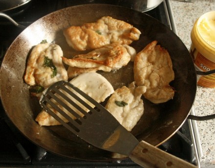 Filety oczyścić z ew. ości, pokroić na kawałki, natrzeć solą i pieprzem, oszczędnie skropić sokiem z cytryny, posypać porwanymi na cząstki liśćmi szałwii. Zostawić co najmniej na pół godziny (można na noc w lodówce). Jeżeli ryba była zostawiona w lodówce, wyjąć ją pół godziny przed smażeniem.