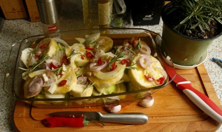 Bakłażana i cukinie obrać ze skóry, pokroić w plasterki. Cebulę i szalotki w krążki. Czosnek drobno posiekać. Naczynie do zapiekania skropić oliwą, układać na niej plasterki bakłażana i cukinii, obficie skrapiając oliwą. Warzywa przekładać cebulą i szalotkami oraz posiekaną papryczką chili. Posypać czosnkiem i listkami rozmarynu, na wierzchu ułożyć kilka całych gałązek tego zioła. Posolić, posypać świeżo mielonym pieprzem. Zapiekać ok. 30 minut w 160 st. C.