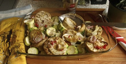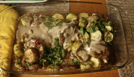 Kto chce mocniejszych wrażeń, może warzywa pod koniec posypać startym serem. Twardym włoskim lub szwajcarskim; ale może którymś z serów pleśniowych? Będzie jeszcze pyszniej, choć kaloryczniej. Ale ja wypróbowałam jeszcze inny sposób. Otóż przed wyjęciem zapiekanki z pieca polałam ją gotowym sosem pieczarkowo-truflowym.