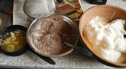 Wymieszać mąkę, kakao, budynie i proszek do pieczenia. Białka z pozostałym cukrem ubić na pianę. Połączyć je z roztartymi z cukrem żółtkami. Masę jajeczną przez sitko zasypać suchymi składnikami. Na końcu wmieszać roztopione masło. Piec z formie kwadratowej lub prostokątnej (28 x 23 cm lub 24 x 24 cm) w 180 st. C przez 30–40 minut.