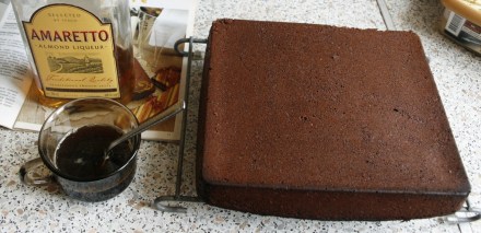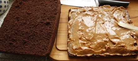 Ciasto wyjąć po lekkim przestudzeniu na kratkę kuchenną. Gdy wystygnie, przekroić je na pół. Dolną połowę nasączyć ponczem z kawy. Następnie nałożyć na nią kajmak.