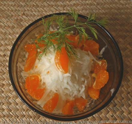 Rzodkiew umyć, oczyścić, zetrzeć na tarce z grubszymi oczkami. Mandarynki podzielić na cząstki, zdjąć z nich błonki, koniecznie wyjąć pestki. Sok zbierać. Z oleju i soku z cytryny oraz soku zebranymi mandarynki wraz z przyprawami sporządzić zaprawę, zalać nią surówkę. Przybrać cząstkami owoców i nacią koperku lub kopru włoskiego.