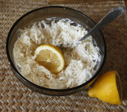 Rzepę oczyścić, zetrzeć na tarce z grubszymi oczkami. Jogurt lub śmietanę wymieszać z solą i sokiem cytrynowym. Surówkę polać, posypać pieprzem cytrynowym.