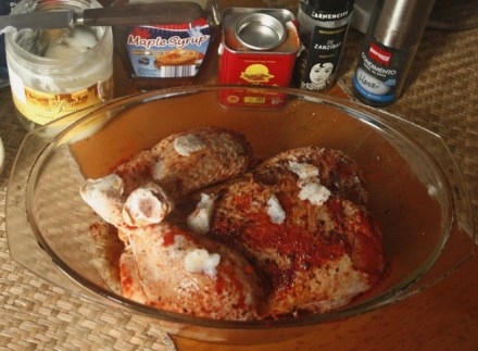 Kurczaka oczyścić, obsuszyć, związać do pieczenia. Starannie natrzeć solą, papryką wędzoną i przyprawą Zanzibar lub własną mieszanką sporządzaną z jej składników. Obłożyć tłuszczem z kaczki. Piec pół godziny w 250 st. C kurczaka położonego na grzbiecie. Odwrócić piersią do dołu, podlać nieco wodą, zmniejszyć temperaturę do 180 st. Piec jeszcze przez 40–60 minut (zależnie od wielkości tuszki). Podczas pieczenia polewać kilka razy płynem spod tuszki. Na kwadrans przed zakończeniem ponownie ułożyć kurczaka piersiami do góry, polać syropem klonowym. Temperaturę zwiększyć do 22 st. C. Dopiec, aż na piersiach i udkach zrobi się skórka chrupka i słodka.