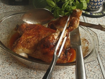 Przy tych surówkach opiszę coś solidniejszego. Dawno nie pokazywałam pieczonego kurczaka. A więc – czas na drób. Kupujemy kurczaka wiejskiego lub zagrodowego. Są lepsze i mniej tłuste. Dlatego też warto kupować tuszki mniejsze.