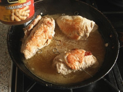 Masło roztopić na patelni, na rozgrzanym obsmażyć zraziki z każdej strony. Podlać bulionem. Dodać pół łyżki pasty tamaryndowej. (Jest kwaskowata, lepiej więc dodać mniej i, jeśli trzeba, dołożyć).