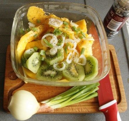 Owoce obrać. Mango pokroić w płatki, a kiwi w plasterki. Cebulkę skroić w krążki, szczypior posiekać. Na dnie salaterki wyłożyć płatki mango, na nich plasterki kiwi i krążki cebuli rozdzielone na pierścienie. Skropić olejem i octem, posypać posiekanym szczypiorem. Posolić i popieprzyć.