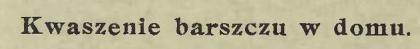 W garnek kamienny lub tak zwaną formę, dwa garnce najmniejszej wielkości, włożyć ćwikłowych buraków do połowy garnka, obranych ze skórki, opłókanych i pokrajanych w cienkie plastry, nalać do pełna wodą zimną z kranu i przykryć pokrywą — postawić w ciepłem miejscu, ale nie gorącem, żeby się nie zaparzył; w miarę brania go do użytku, dolewać zimnej wody, a trwać będzie parę tygodni. Zwyczajny zaś barszcz przyrządza się, biorąc kromkę chleba razowego, którą kraje się na kawałki i kładzie do garnka, dodaje cebulę obraną i parzy gorącą wodą, aby przykryła chleb, gdy woda ostygnie, dolewa się zimnej wody do pełności, można wkrajać kilka buraków dla koloru. Tak jeden, jak drugi barszcz, gdy kwaśny, zlewać w butelki, zakorkować i mieć dla zapasu przechowany.