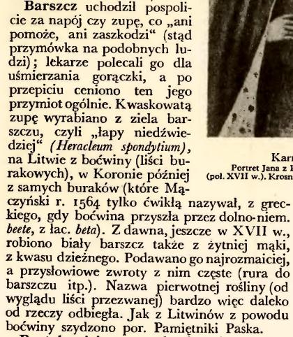 Nakwas z buraków (które dawniej, tak białe jako i czerwone, nazywano w Polsce ćwikłą), znajdowało się zawsze w każdym domu polskim na wsi, tak kmiecym jak szlacheckim, oddzielne naczynie drewniane. Po dworach była to zwykle duża dębowa kłoda, czyli beczka, z klepek bez dna górnego, płótnem przykryta, w której kwaszono wiecznie buraki i kwas czerpano, zarówno na barszcz dla państwa i gości, jak dla czeladzi i najbiedniejszych, jeżeli zdarzyło się, że był kto we wsi, niemający na zimę buraków i przychodził do kuchni dworskiej z garnuszkiem, w który mu kwasu nalewano. Był jeszcze dość powszechny użytek leczniczy z tego kwasu. Piszący to pamięta, jak wszyscy cierpiący na ból gardła otrzymywali we dworze płókanie z kwasu burakowego i miodu przaśnego, co dziwnie wszystkim pomagało. Najpowszechniejsze sposoby podawania barszczu w domach, polskich były: 1) barszcz czerwony z „uszkami i rurą”, 2) zabielany z wędliną i 3) czysty, postny, podawany na śniadanie po całonocnych tańcach, lub jako jedyny posiłek południowy w dniu wigilii Bożego Narodzenia, 4) we dni postne jadano barszcz z krupami i przyprawą z suszonych grzybów. […]