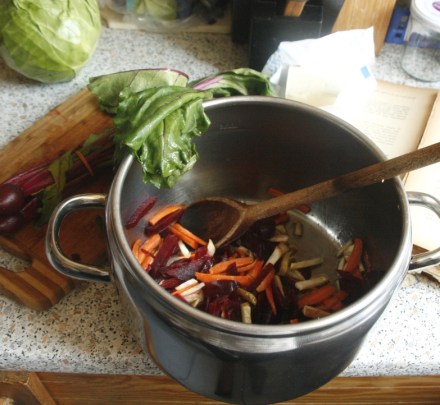 Marchewki, kawałek korzenia selera, łodygę pora, pieczarki i drobne buraczki z botwinki pokroić w paseczki (julienne), zasmażyć w maśle.