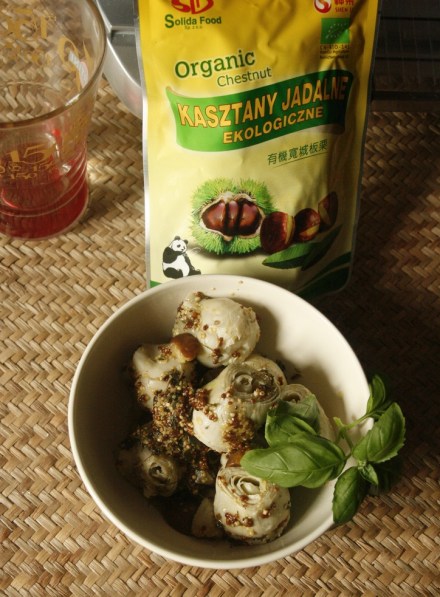 Połączyłam je w sałatce ze słodkawymi wszak kasztanami. Nie jest to sezon kasztanów, ale można kupić takie już ugotowane, choć jeszcze w nadciętych łupinkach. Są dość dobrej jakości.