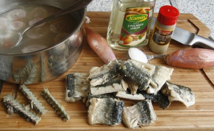 Wywar rybny z kilkoma ziarenkami ziela i pieprzu oraz liściem laurowym – posolony i popieprzony do smaku – gotować 10 minut z krążkami szalotki i pokrojoną w paski marchewką, włożyć do niego belonę, gotować dobry kwadrans. Rybę ostrożnie wyjąć. Gdy przestygnie, wyjąć z niej kręgosłup wraz z przylegającymi ościami (biologiczne poprawnie to są… kości!), odciąć płetwy, a całość podzielić na kawałki.