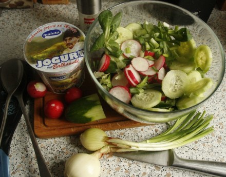 Do takich kotlecików podałam nie warzywa gotowane, jak chciały dawne mistrzynie rondla i patelni, ale sałatkę wiosenną. Nowalijki, czyli świeży ogórek, rzodkiewkę i dymkę, a więc cebulkę wraz ze szczypiorem, ułożyłam na listkach roszponki. Wszystko zaprawiłam jogurtem bałkańskim wymieszanym z łyżką oleju słonecznikowego. No i, oczywiście, z solą i pieprzem. Kotlecik i sałatka podane do bagietki lub ciabatty pozwolą jakoś przejść przez dziwną jak na maj pogodę. A raczej niepogodę.