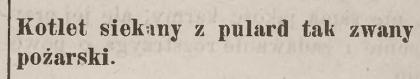 rumianem masłem. Podać z groszkiem, marchewką, szpinakiem lub kartoflami „purée”. To są prawdziwe kotlety pożarskie, jakie podają w restauracjach pierwszorzędnych; kto chce je zrobić tańszym sposobem, może zamiast pulardy użyć cielęciny, ale już nie będą tak delikatne. Takie kotleciki dobre są dla chorych na żołądek i dla dzieci.