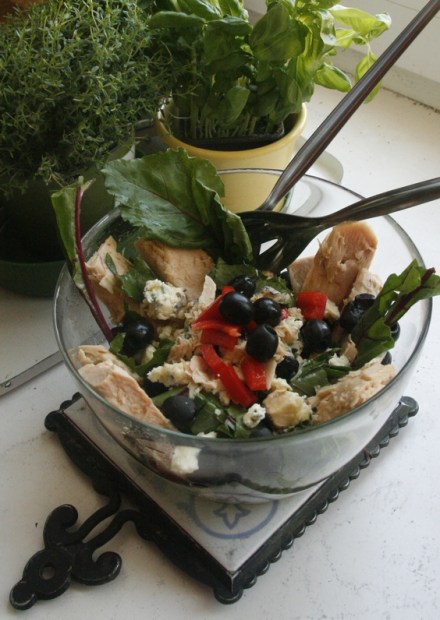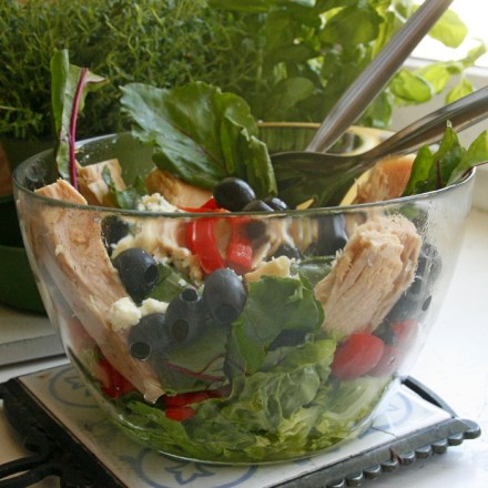 Obiad prosty i szybki, ale nie byle jaki. Sałatka. I wystarczy. Dla wszystkich, którzy chcą trzymać wagę i linię, ale starają się jeść i smacznie, i zdrowo. A więc dostarczając organizmowi wszystkiego, co wartościowe. Znajdziemy to w jarzynach, w wysokobiałkowych składnikach, czyli w mięsie lub w rybach, i w dobrych tłuszczach. Nie unikajmy ich. Bez tłuszczów organizm nie działa dobrze. Przecież rozpuszczają się w nich, i dzięki temu przyswajają, niektóre witaminy. Najzdrowsze tłuszcze to te roślinne. Zawiera je na przykład oliwa. A więc i oliwki. Uczyniłam je jednym z głównych składników mojej sałatki.
