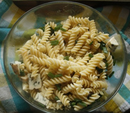 Ten nasz makaron – świderki czyli włoskie fusilli – gotowałam krócej niż podano na opakowaniu, a posypałam pokruszonym serem pleśniowym – może to być gorgonzola. Taki makaron jest znakomitym daniem samodzielnym lub dodatkiem czy wstępem do innych dań. U nas nastąpiły po nim krewetki.