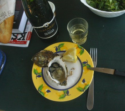 Jak Francja-elegancja, to niech będą ostrygi. Ich wydobywaniem z muszli rozpoczęliśmy jeden z pierwszych obiadów, którego przewodnim hasłem było morze. Sète miasto pobliskie Agde, jest znane z owoców morza, a zwłaszcza z ostryg, których hodowle znajdują się w pobliskim jeziorze Étang de Thau. Można je oglądać z łodzi o szklanych dnach. Może zrobimy to następnym razem. Teraz ograniczyliśmy się do kupienia ostryg na targu. Tak dużych i tak smacznych jeszcze nie jedliśmy! Mimo że nie kupowaliśmy ich w miesiącu z literą „r” w nazwie, gdy tradycyjnie są uważane za najsmaczniejsze. Ale może przesąd dotyczy ostryg poławianych z morza, a nie hodowlanych.