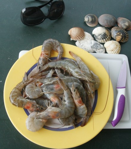 Takich świeżych krewetek ja nawet nie solę. Są delikatnie słodkawe bez żadnych dodatków; no, z kroplą soku z cytryny. Dla amatorów mocniejszych smaków można na stole postawić jakiś sos majonezowy (na kempingu oczywiście sklepowy, ze słoiczka). U nas był to sos pieprzowy oraz nie pokazany na zdjęciu tutejszy pikantny i różowy od ostrej papryki sos rouille.
