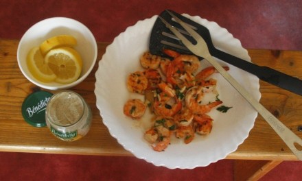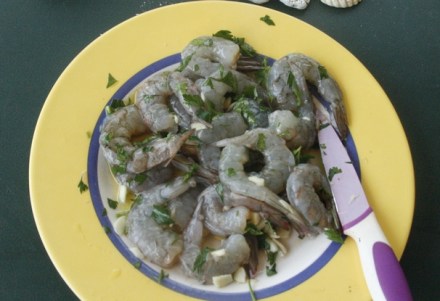 Krewetki oczyścić, jak opisano wyżej. Natkę i czosnek przesiekać. Krewetki przemieszać z natką i czosnkiem (proporcje zależą od tolerancji czosnku – od jednego ząbka po… cztery, pięć). Skropić oliwą. Zostawić co najmniej na kwadrans.
