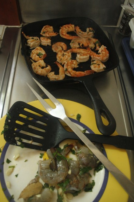 Jeżeli nie mamy grilla ani patelni grillowej (biorę ją z domu), smażymy krewetki na patelni zwykłej. W oliwie, do której dla smaku można dodać łyżkę masła. Sosem powstałym podczas smażenia obowiązkowo skrapiamy krewetki. Z talerzy wymuskujemy go z pomocą bagietki. Te francuskie są jednak niedościgle niezrównane.