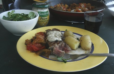 Do tuńczyka podałam majonezowy sos pieprzowy. A nasz domowy sommelier dobrał miejscowego merlota. Czerwone wino do ryby? A czemu nie? Ryba wszak też była czerwona. Tuńczyk, ratatouille i merlot okazały się połączeniem doskonałym. Smakiem wakacji.