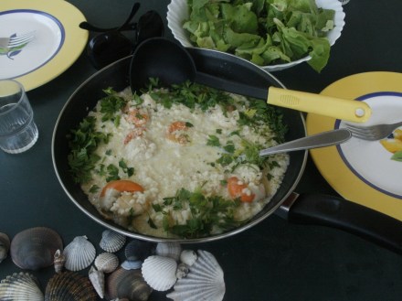 Proste, względnie szybkie, bardzo smaczne. Zwłaszcza do schłodzonego lokalnego białego wina picpoul. Kto nie tyka owoców morza, takie risotto niech przygotuje z pieczarkami lub innymi grzybami. Niedługo – o ile nie będzie za sucho – u nas powinny się pojawić kurki.