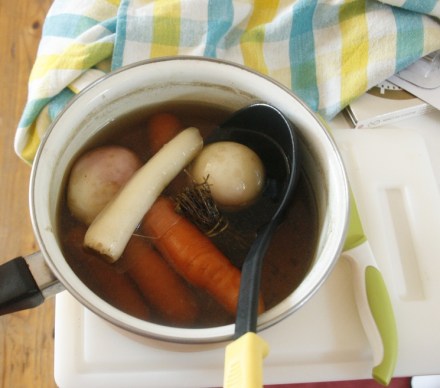 wywar z 2 marchwi, 2 rzepek, pietruszki i bouquet garni z tymianku i liścia laurowego
