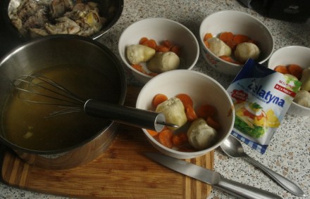 Resztki drobiu oddzielić od kostek, podzielić na małe kawałki. Marchewkę i seler pokroić w drobną kostkę. (Jeżeli nie został rosół lub korzystamy z kurczaka pieczonego, gotujemy z kostki bulion drobiowo-warzywny, a w nim co najmniej marchewkę). W rosole rozpuścić żelatynę, zgodnie z opisem na opakowaniu, dopieprzyć, ew. posolić.