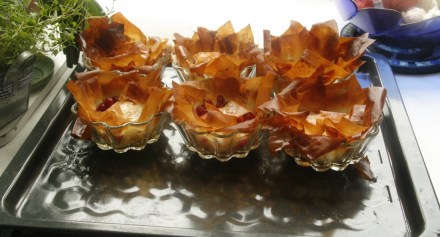 A deser? To już musowo z owocami! Wygląda skomplikowanie, ale przygotowuje się go szybko i prosto. Byle się zaopatrzyć w gotowe ciasto filo. Można je dostać w większych marketach. Warto mieć w domu jego zapasik. Nie tylko na bakławę.
