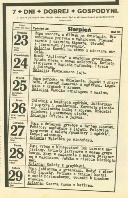 „As” – pismo przeznaczone przede wszystkim dla czytelniczek – miało także kącik kulinarny. I to dość bogaty. Prowadziła go – jak podejrzewam, bo zwykle strony nie były podpisane – Zofia Szyc-Korska, ta sama, która pisała o kuchni w „Kuryerze Kobiecym”, stałych kolumnach wchodzących w skład dużego „Kuryera”. W gazecie notki były suche, ubogie, choć ciekawe. W „Asie” kuchni poświęcano całą kolumnę, a nawet więcej! Była zawsze ilustrowana i ciekawie łamana. Jedną z jej części stanowiło menu tygodniowe. Proszę spojrzeć, jak dysponowano obiady i kolacje latem roku 1938.