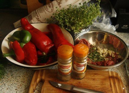 Na 8–10 papryk bierze się pół funta (25 dkg) mielonego mięsa wieprzowego, pół na pół z wołowem lub cielęcem, dodaje trzy łyżki ugotowanego na sypko ryżu, łyżkę smażonej cebulki i jedno jajo. Dobrze utartym farszem napełnia się papryki, układa je w rynce na maśle, zalewa szklanką rosołu z kości i kilku łyżkami przetartych, uduszonych poprzednio pomidorów, i dusi na wolnym ogniu około godziny.