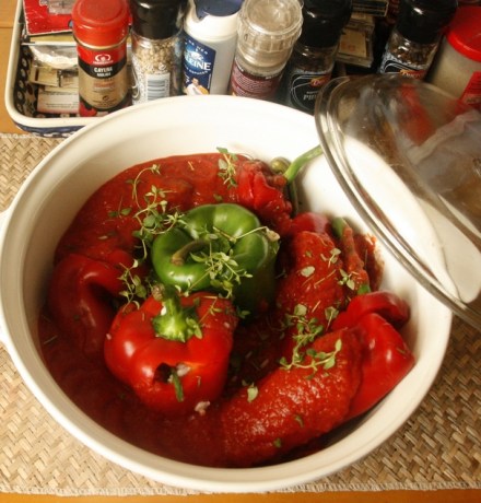 Papryki okrągłe przygotować i obgotować tak samo. Ryż wyrobić z przyprawami i posiekanym koperkiem. Wypełnić nim papryki, ustawić na środku naczynia. Zalać sosem pomidorowym.