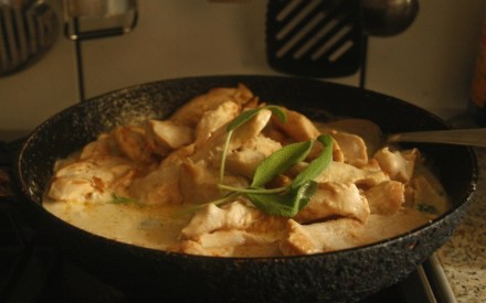 Do sosu włożyć paski kurczaka, dodać listki szałwii posiekane lub porwane na małe paseczki. Dusić pod przykryciem, aż kurczak zmięknie (20–30 min) a sos zgęstnieje. Doprawić pieprzem. Podawać ze świeżymi listkami szałwii.