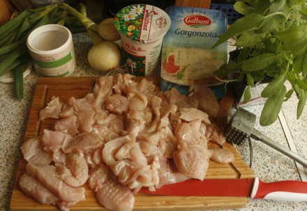 Piersi kurczaka umyć, osuszyć, pokroić w paski w poprzek włókien lub w plasterki (lekko je rozbić), bardzo lekko posolić (gdy dodaje się bulion, z solenia można zrezygnować). Masło rozgrzać na patelni z grubym dnem, obsmażać paski kurczaka partiami, wyjmować i trzymać w cieple. Po usmażeniu wszystkich zalać patelnię winem, bulionem lub wodą, rozprowadzić pozostałości po smażeniu. Płyn zredukować do połowy, rozprowadzić śmietaną, Powstały sos mieszać z oddawaną porcjami gorgonzolą.
