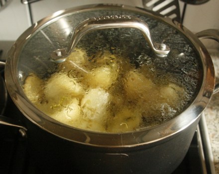 Te ziemniaki są bardziej duszone niż gotowane, dzięki czemu zachowują całą urodę swojej młodości. Opłaca się nieco czasu poświęcić na otarcie z nich skórki, a jeżeli ona pozostanie, nie szkodzi. Byle były dobrze umyte. Nie musimy być drobiazgowi. Szkoda czasu. Zadbajmy tylko, aby podczas duszenia garnek z ziemniakami był przykryty szczelnie.
