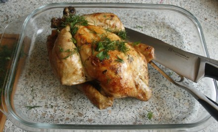 Do takiego kurczaka oprócz młodych ziemniaczków podajemy sałatę. Raczej już nie tę po polsku, czyli ze śmietaną, jeżeli skorzystaliśmy z powyższej „wybornej przymieszki”. Można ją doprawić oliwa i sokiem z cytryny.