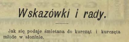 Tradycyjnie do kurczaków podawano śmietanę. Jak? Radę znalazłam w „Tygodniku Mód i Powieści” z roku 1899. W krótkiej notce są właściwie dwie rady. Podam obie. Może ktoś będzie chciał skorzystać także ze sposobu pieczenia kurcząt w słoninie? Ale wtedy poda je bez „przymieszki” ze śmietany. Tę podajemy do kurcząt z nadzieniem z bułeczki tartej. Z młodymi ziemniaczkami – stanowi połączenie doskonałe.