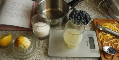 Z żółtej skórki cytryny zeskrobać paseczki (bez białego miąższu). Cukier, kwiaty lawendy i paseczki skórek zalać w rondelku 125 ml wody. Zagotować, mieszać, aż cukier się rozpuści. Borówki zmiażdżyć widelcem, wrzucić do syropu, odstawić co najmniej na 5 minut [lepiej dłużej]. Mieszankę przecedzić przez gęste sitko. Borówkowy syrop wymieszać z sokiem cytrynowym. Ostudzić. Dalej postępować, jak w instrukcji maszynki do lodów. Zamrażając tradycyjnie wlać do foremek, autorka zaleca je mrozić co najmniej 4 godziny.