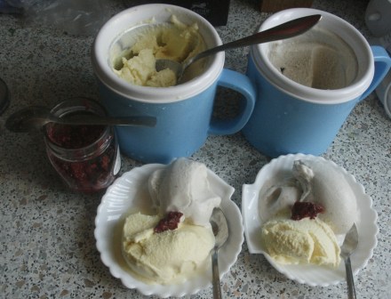 Takich wymyślnych lodowych cudów jeszcze nie wyrabiam. Dopiero się uczę sztuki dobierania składników we właściwych proporcjach, kręcenia, mrożenia. Dotąd korzystałam z przepisów dołączonych do maszynki i z książeczki, którą wypatrzyłam w księgarni (Shelly Kaldunski „Lody”). Jak się udały? Smakowo – wyborne, miałam natomiast drobne kłopoty związane z mrożeniem, a więc z ich konsystencją (najpierw za płynne, potem zbyt zmrożone). Sądzę jednak, że to kwestia wprawy i zachowywania proporcji z przepisów, zwłaszcza na początku. Jak zwykle w kuchni: procentuje doświadczenie..
