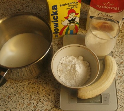 Obranego banana pokroić w plasterki i zemleć blenderem. Śmietanę lekko ubić. Zmieszać miąższ banana i śmietanę, rozetrzeć z mlekiem, cukrem waniliowym [nie podanym wśród składników; zastosowałam wanilię w proszku] i cukrem pudrem. Masę schłodzić w lodówce do 5–10 st. C., wlewać ją do włączonej maszynki do lodów. Lody wyrabiać zgodnie z instrukcją 20–30 min.
