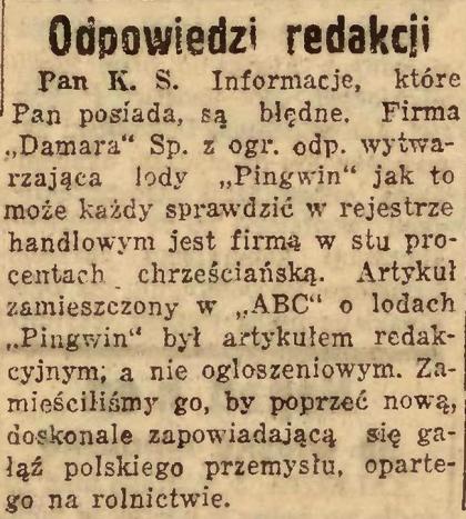 W latach trzydziestych te właśnie lody weszły na polski rynek. Oczywiście, musiały się borykać z konkurencją. Ta rozpuściła miażdżące wówczas insynuacje, że właścicielami wytwórni są Żydzi. Dla niektórych był to dostateczny powód, by „Pingwiny” omijać szerokim łukiem. No i upadek firmy gotowy!