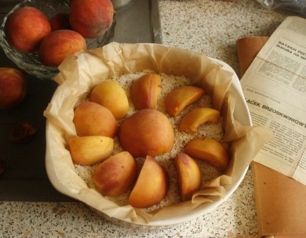 Kilka uwag: zwykle placek piekłam bez żadnych orzechów. Wtedy można na koniec posypać cukrem pudrem. Bo warstwy orzechowej cukrem nie warto posypywać. Zresztą bez niej brzoskwinie lepiej zatapiają się w cieście.