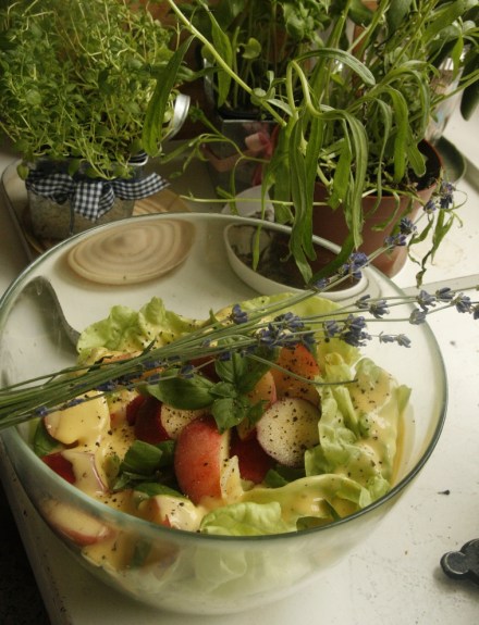 Sałatę umyć, ususzyć, podzielić na liście, porwać je na dwie-trzy cząstki. Listkami wyłożyć salaterkę. Na nich ułożyć cząstki brzoskwiń. Posypać porwanymi listkami bazylii i kwiatkami lawendy. Przed podaniem polać winegretem i posypać pieprzem z młynka.