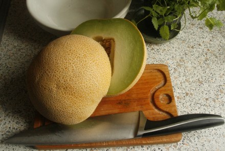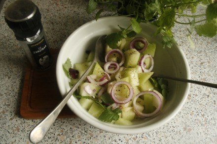 Co z nich robić? Klasyczne jest podanie na przystawkę plastra melona z szynką, najlepiej dojrzewającą, staropolską, parmeńską, westfalską, bajońską… Ale z gotowaną też nie będzie zły. A przyrządzenie takiego entrée do obiadu nie zabierze czasu, energii, nie wymaga specjalnych umiejętności. Byle dojrzały miąższ melona odkroić od twardej skórki (mniej lub bardziej grubej), a ze środka usunąć pestki. Potem miąższ wystarczy pokroić w nie za grube półkoliste cząstki, owinąć je szynką, ewentualnie spiąć je wykałaczkami. Kto lubi, może obok kapnąć majonezu lub sosu tatarskiego, czosnkowego, Thousand Islands. To wszystko. Nie bardziej skomplikowane są pikantne sałatki z melona. Niedawno pokazywałam jedną, dzisiaj kolejna. Można ją podawać zarówno jako wstęp do obiadu, jako dodatek do dania głównego, a nawet, przy restrykcyjnej diecie, jako samo danie główne…
