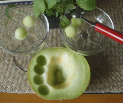 Z połówek melona specjalną łyżeczką wyciąć kulki.